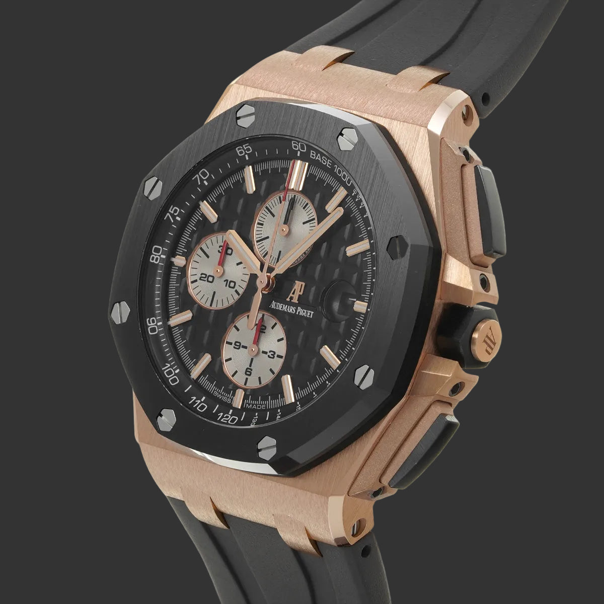 Mit ihrem 44 mm großen, achteckigen Gehäuse aus Roségold und der schwarzen Keramiklünette mit Tachymeterskala setzt diese Offshore ein kompromissloses Statement. Das schwarze Mega-Tapisserie-Zifferblatt, ein Markenzeichen der Marke, bietet Tiefe und optimale Ablesbarkeit, die durch die roségoldenen Stundenmarkierungen und Zeiger zusätzlich unterstrichen wird.