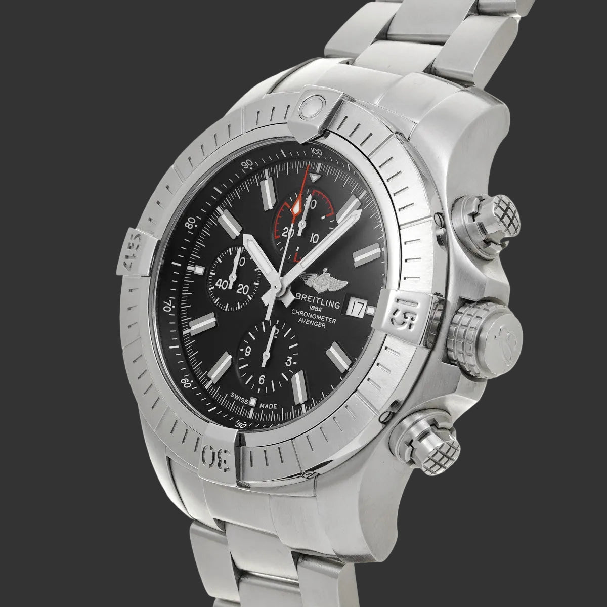 Diese Breitling Super Avenger in exzellentem Zustand wird als Komplettset mit Originalbox und Papieren angeboten. Sie wurde von unseren Uhrmachern geprüft und authentifiziert und verfügt über eine einjährige Garantie von L'Écrin Genève für absolute Sicherheit.