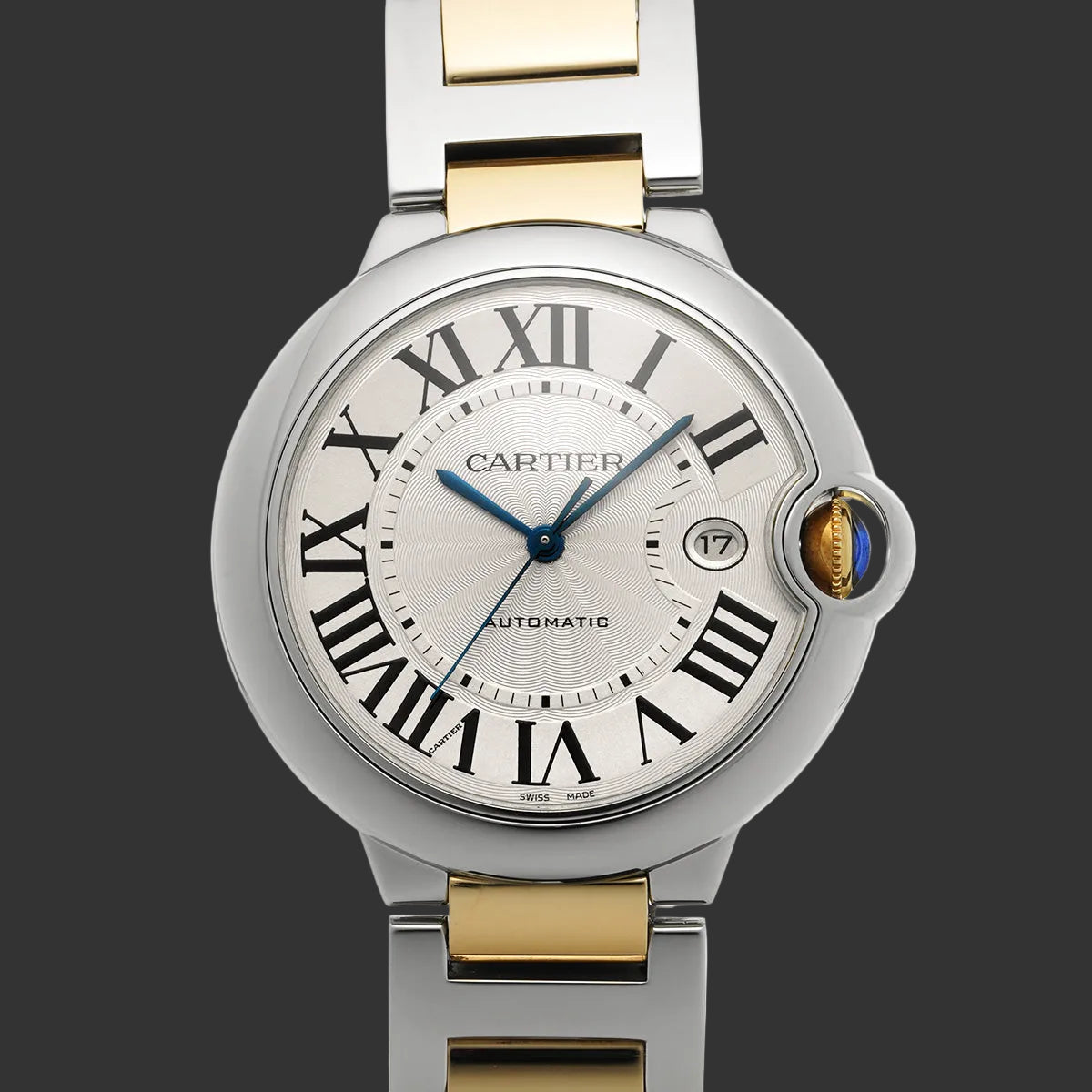 Als echte Ikone des Hauses Cartier verkörpert der Ballon Bleu französische Kühnheit im Design und handwerkliche Raffinesse. Diese Referenz W69009Z3 von 2009 besticht durch ihr rundes Gehäuse mit 42 mm Durchmesser aus Stahl, erkennbar an der geschützten Krone mit blauem Saphir-Cabochon.