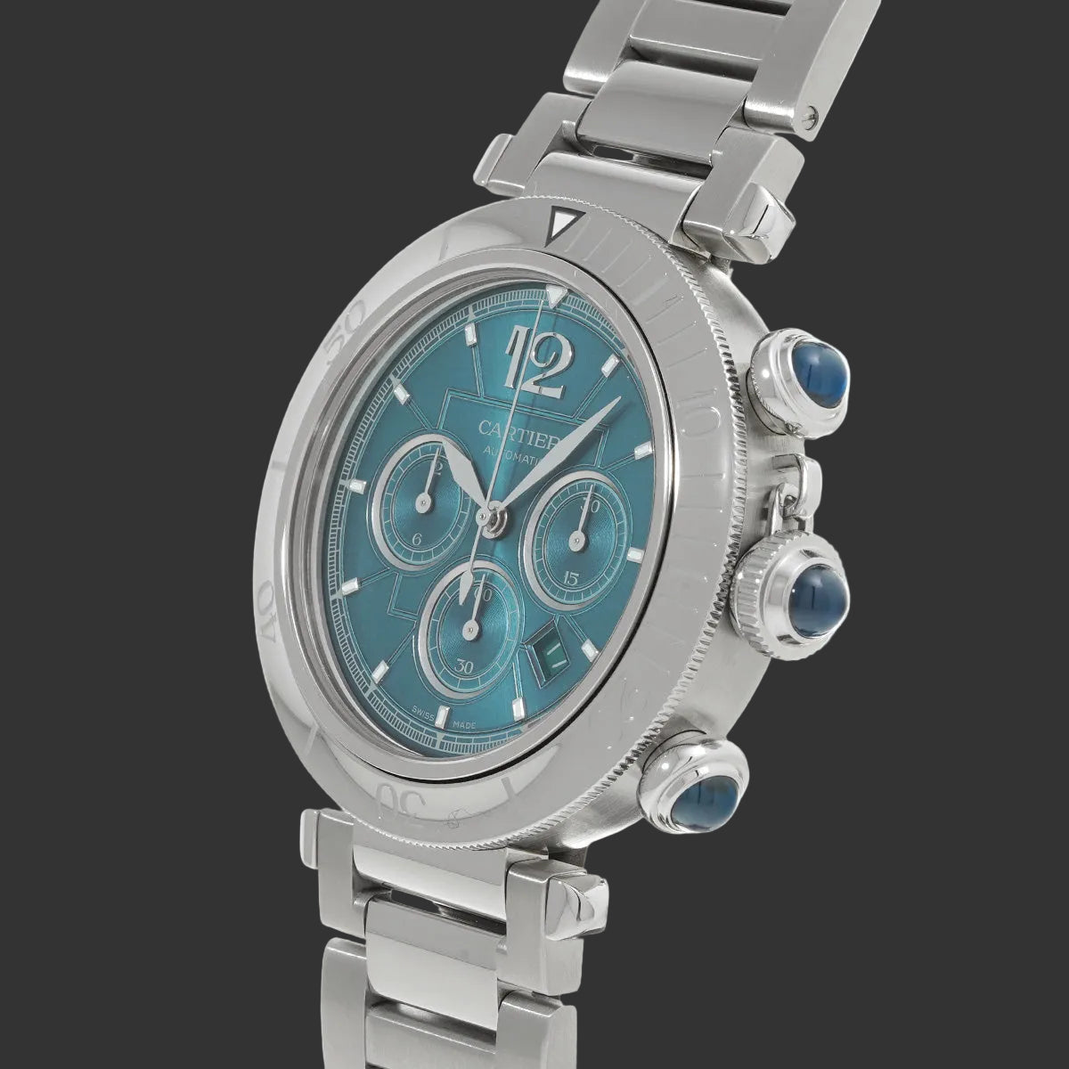 Die Cartier Pasha verkörpert die Kühnheit, die das Haus seit den 1980er Jahren pflegt. Mit ihrem faszinierenden türkisblauen Zifferblatt und den drei perfekt integrierten Chronographenzählern unterstreicht diese Referenz WSPA0039 einen entschieden sportlichen Charakter, ohne dabei jemals die für Cartier typische Raffinesse zu verleugnen.