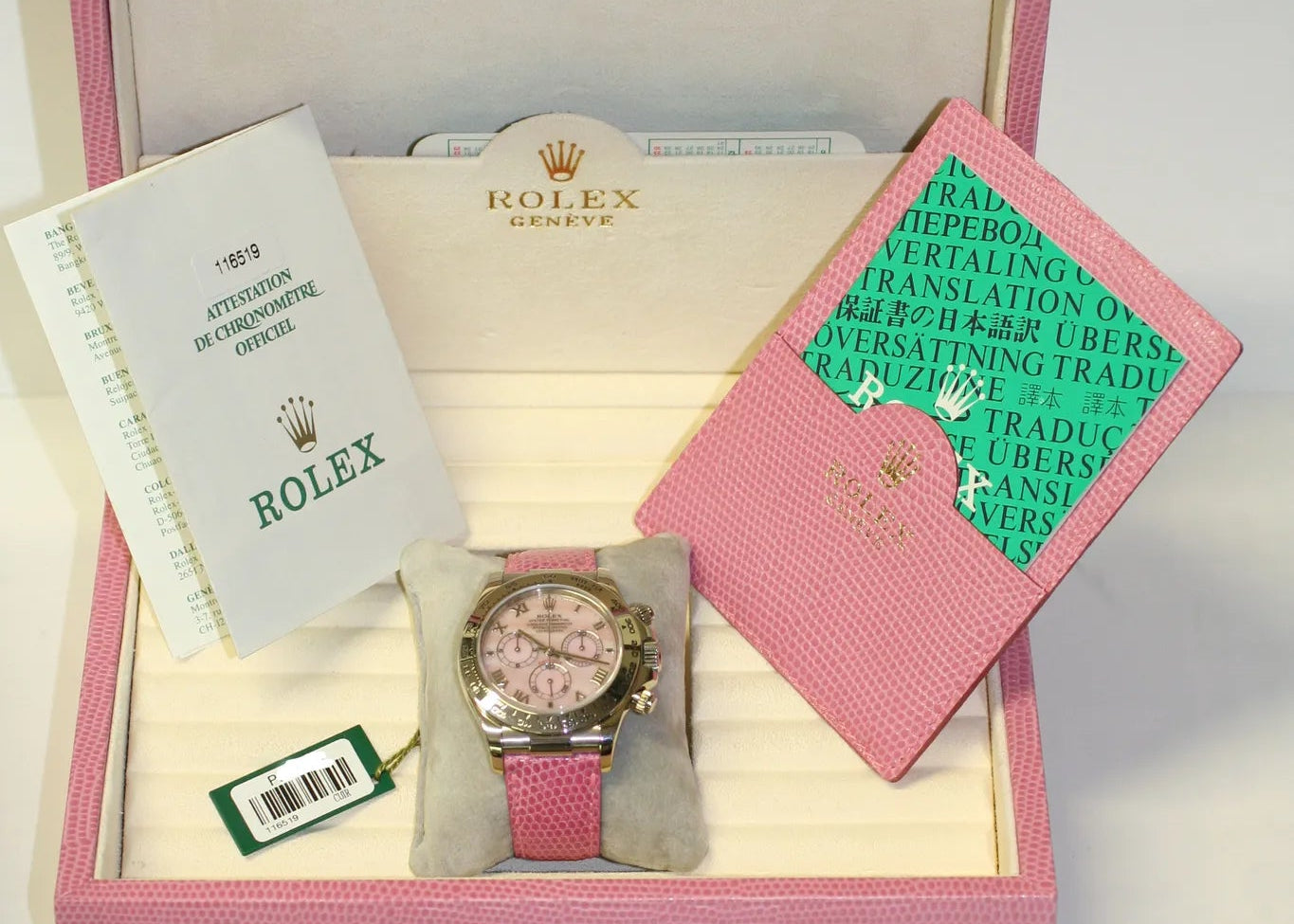 Die Cosmograph Daytona ist seit 1963 einer der ikonischsten Chronographen von Rolex. Diese Referenz 116519 Beach Pink aus dem Jahr 2001 ist Teil einer streng limitierten Serie von nur 50 Exemplaren. Das 40-mm-Gehäuse aus Weißgold wird mit einem rosa Perlmuttzifferblatt mit römischen Ziffern und einem rosa Eidechsenlederarmband kombiniert, was eine einzigartige Kombination im Daytona-Universum schafft. Die Faltschließe aus Weißgold und das Saphirglas vervollständigen diese Automatikuhr mit einer tadellosen Verarbeitung. Angeboten als Full Set mit ihrer rosa Box und Originalpapieren von 2001, ist diese Daytona Beach Pink für den erfahrenen Sammler geeignet, der ein seltenes Stück sucht, das Exklusivität und einzigartigen Charakter vereint.