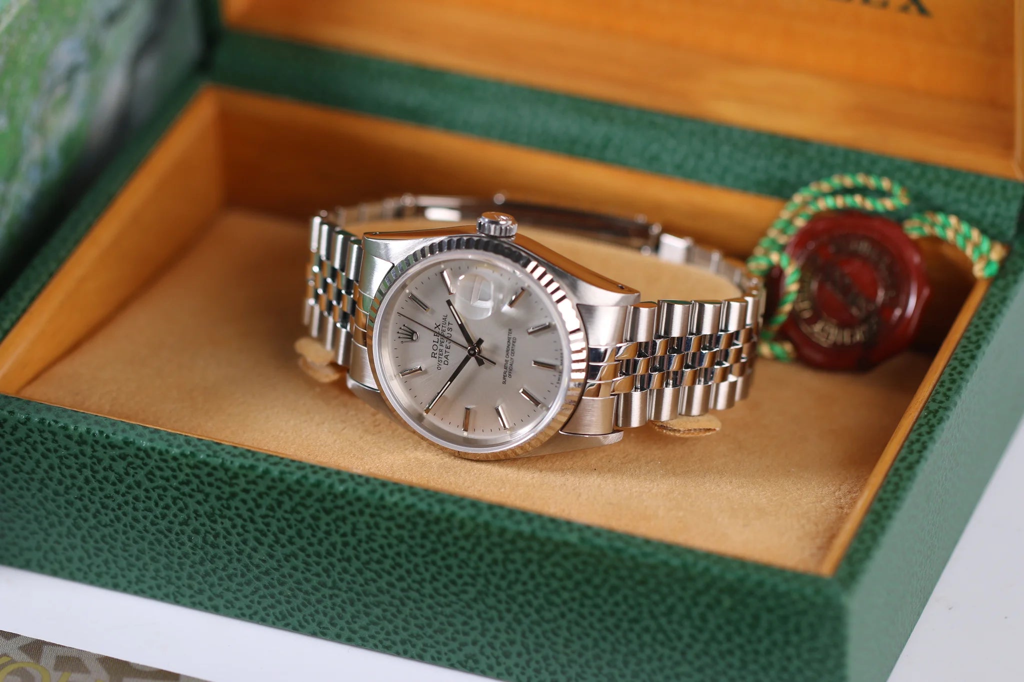 Die Datejust ist seit 1945 eines der ikonischsten Modelle von Rolex. Diese Referenz 16234 kombiniert ein 36-mm-Stahlgehäuse mit einer geriffelten Lünette aus Weißgold, wodurch ein eleganter Kontrast entsteht, der charakteristisch für die Kollektion ist. Das silberne Zifferblatt mit Sonnenschliff, Stabindizes und leuchtenden Tritiumzeigern bietet optimale Ablesbarkeit. Ausgestattet mit einem Jubilé-Armband und geschützt durch ein Saphirglas, kann diese Automatikuhr sowohl im Alltag als auch zu formellen Anlässen getragen werden. Ausgestattet mit dem berühmten Kaliber 3135, das für seine Zuverlässigkeit und Präzision bekannt ist, eignet sich diese Datejust sowohl für Sammler, die eine gebrauchte Rolex suchen, als auch für Liebhaber, die eine vielseitige erste Luxusuhr suchen.
