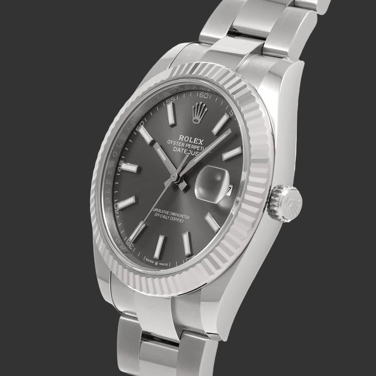 Als wahres Sinnbild prestigeträchtiger Uhrmacherkunst verkörpert die Rolex Datejust 41 seit Jahrzehnten die perfekte Verbindung von Eleganz und Robustheit. Dieses Modell mit der Referenznummer 126334 aus dem Jahr 2021 besticht durch sein schiefergraues Zifferblatt mit dezenten Lichtreflexen, die durch die Stabindizes aus Weißgold und die ikonischen Leuchtzeiger zusätzlich hervorgehoben werden.