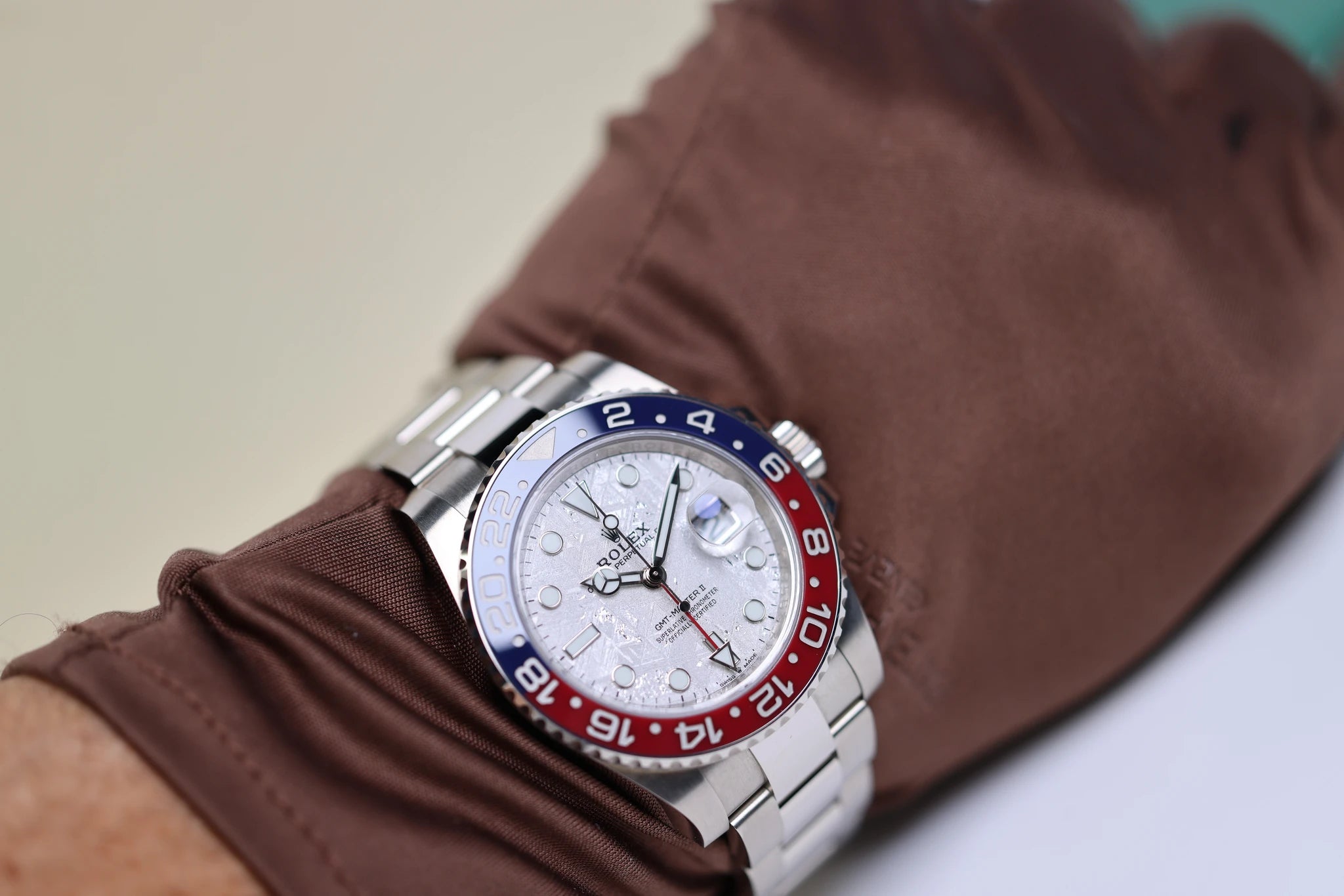 Das dezent polierte 40-mm-Gehäuse aus 18-karätigem Weißgold verleiht dieser GMT Master II eine imposante Präsenz und sorgt gleichzeitig für eine perfekte Balance am Handgelenk. Das ebenfalls aus Weißgold gefertigte Oyster-Armband bietet außergewöhnlichen Tragekomfort und einen zeitlosen Look, der durch eine sichere Faltschließe zusätzlich betont wird. Das Meteoriten-Zifferblatt, ein charakteristisches Merkmal der Referenz 126719BLRO, besticht durch seine natürlichen Reflexionen und himmlischen Motive – jedes Exemplar ist ein Unikat. Die Leuchtzeiger und -indizes garantieren optimale Ablesbarkeit, während die beidseitig drehbare Lünette aus roter und blauer Keramik – liebevoll „Pepsi“ genannt – einen lebendigen Farbtupfer setzt, der Kennern edler Uhren sofort ins Auge fällt.