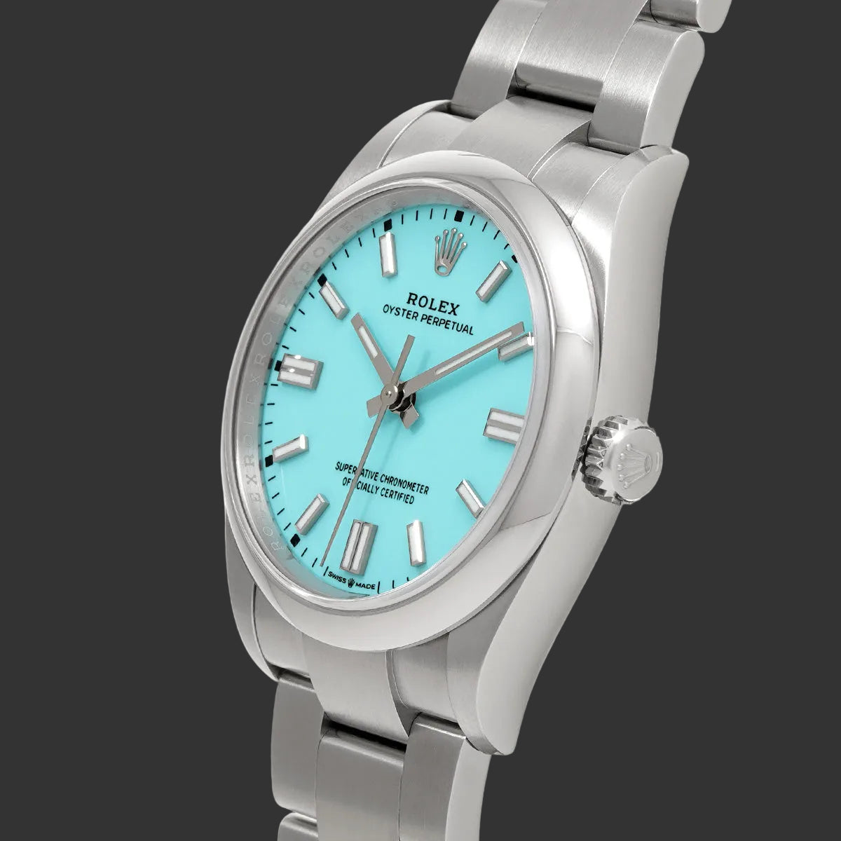 Mit ihrem leuchtend türkisfarbenen Zifferblatt zählt die Rolex Oyster Perpetual 36 Referenz 126000 zu den begehrtesten Uhren der aktuellen Kollektion. Dieser lebendige Farbton, auch „Tiffany-Blau“ genannt, verleiht der Uhr einen betont modernen Charakter und bewahrt gleichzeitig die zeitlose DNA der Genfer Marke.