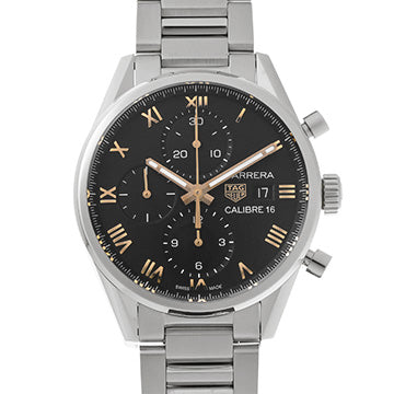 Der fesselnde Kontrast zwischen dem strukturierten schwarzen matten Zifferblatt und den vergoldeten römischen Indexen verleiht dieser Carrera eine ausgeprägte Persönlichkeit. Die zentrale rote Chronographenzeiger bringt einen subtilen sportlichen Touch, während die drei symmetrischen Zähler das Schweizer Uhrmacher-Handwerk unterstreichen.