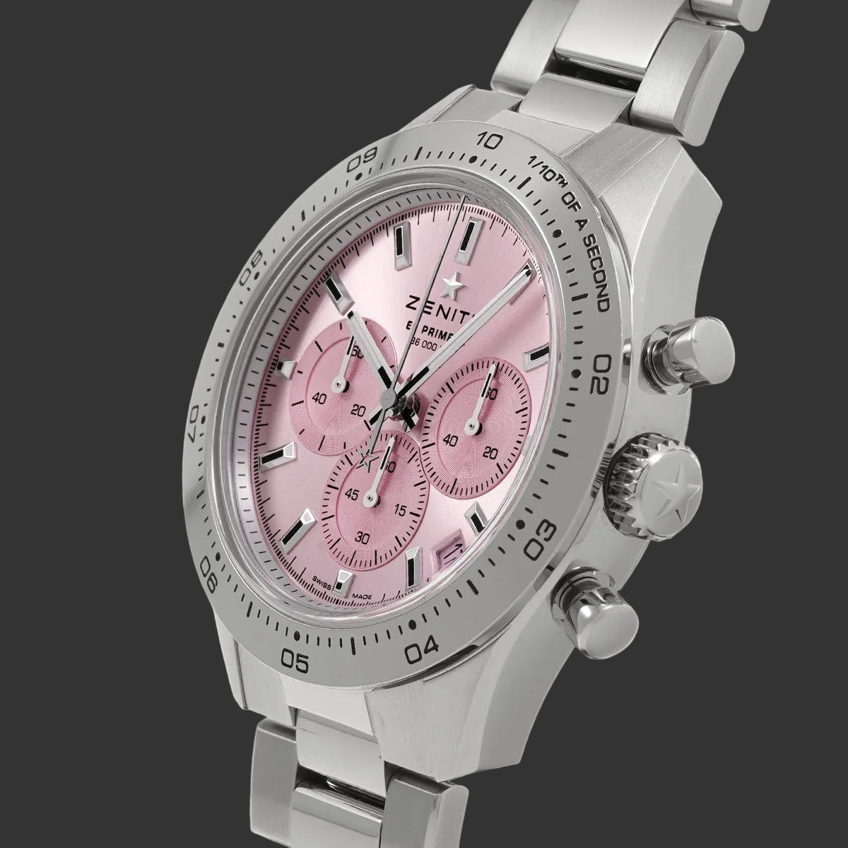 Das 41-mm-Edelstahlgehäuse spielt mit dem Kontrast zwischen polierten und gebürsteten Oberflächen, während der zartrosa Farbton des Zifferblatts eine unerwartete Eleganz verleiht. Die in Zehntelsekunden unterteilte Lünette ist eine Hommage an die DNA des El Primero, des legendären Uhrwerks mit 36.000 Halbschwingungen pro Stunde.