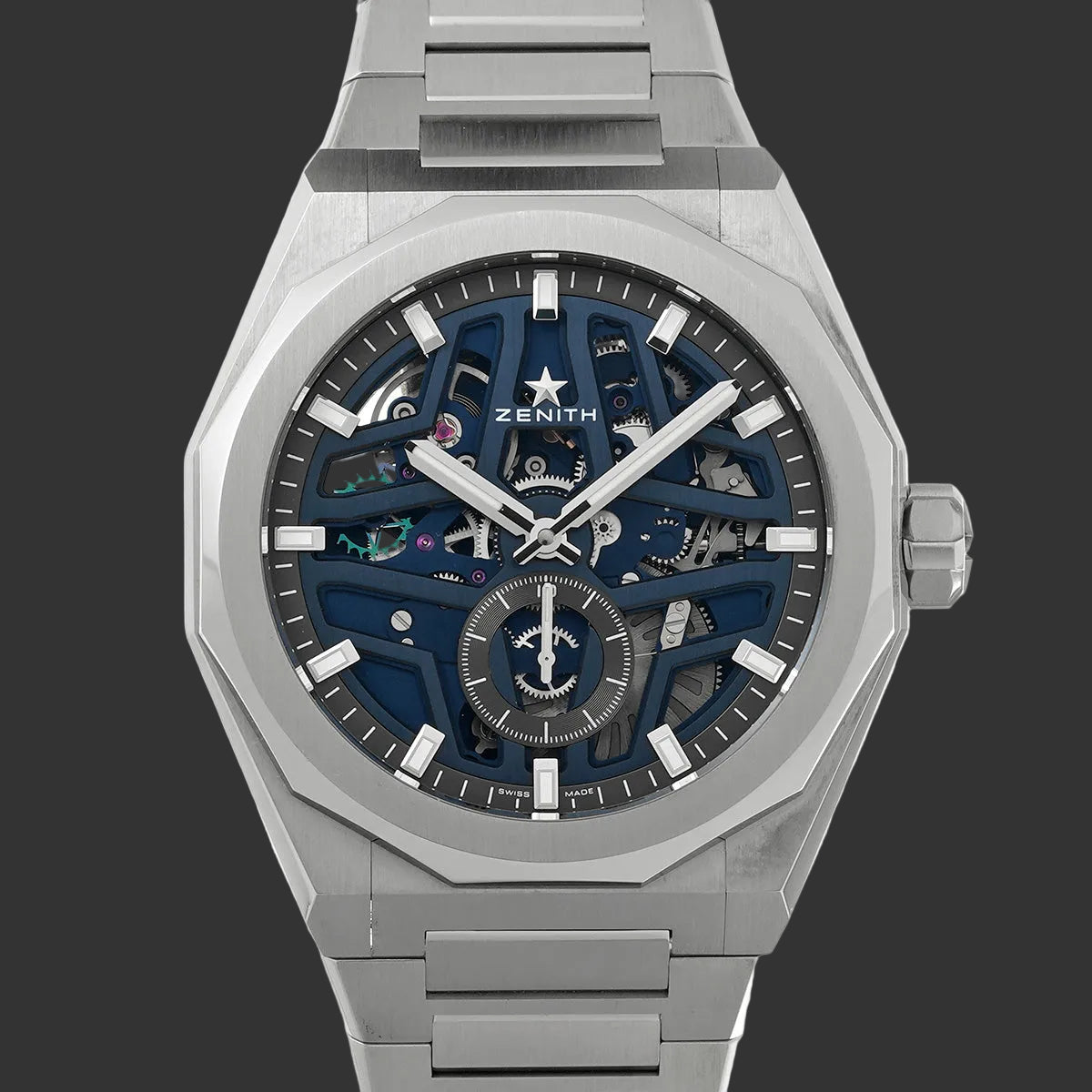Mit ihrem achteckigen Gehäuse von 41 mm aus Edelstahl setzt diese Defy Skyline einen ausgeprägten Charakter. Das Spiel aus polierten und gebürsteten Oberflächenfinishes fängt das Licht ein, während das integrierte Armband die Architektur fließend verlängert. Eine Uhr, die auffällt, ohne jemals zu viel zu tun.