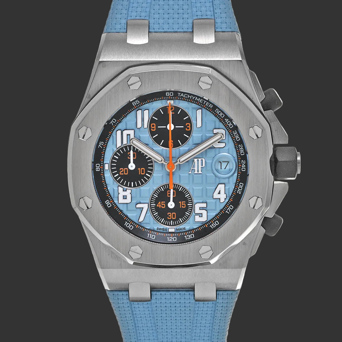 The perfect embodiment of sporty luxury, this Royal Oak Offshore Chronograph reveals a strong character with its sky-blue dial and vibrant orange accents. A timepiece that commands respect on the wrist while retaining the iconic DNA of the Le Brassus manufacture.