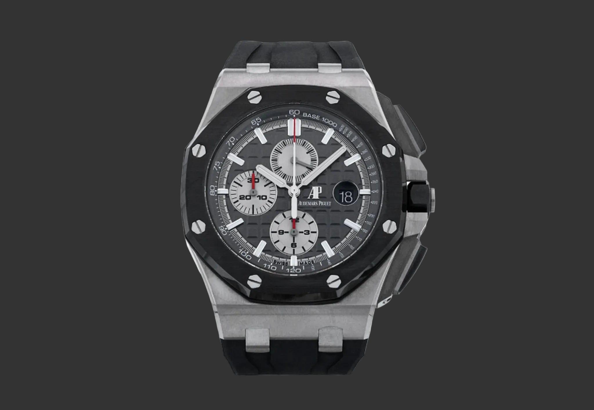 The Royal Oak Offshore Chronograph embodies Audemars Piguet's watchmaking audacity. This 26400IO reference combines a 44 mm titanium case with a black ceramic tachymeter bezel, creating a striking contrast with the slate gray dial and its signature Méga Tapisserie pattern.