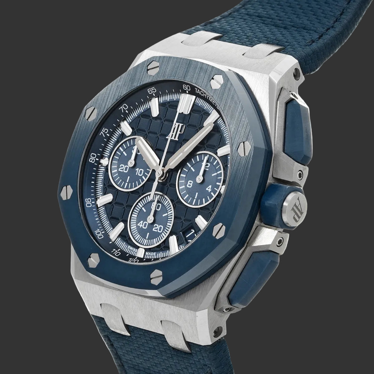 The Royal Oak Offshore has embodied Audemars Piguet's horological audacity since 1993. This reference 26420SO combines assertive character and exceptional finishes with its Mega Tapisserie blue dial and its ceramic bezel with eight signature hexagonal screws.