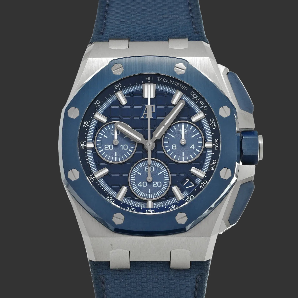 Perfect embodiment of Audemars Piguet's watchmaking audacity, this Royal Oak Offshore Chronograph imposes its presence with a 43 mm steel case enhanced by a blue ceramic bezel. The deep blue sunburst dial, a signature of the house, gives this timepiece a strong personality that leaves no one indifferent.
