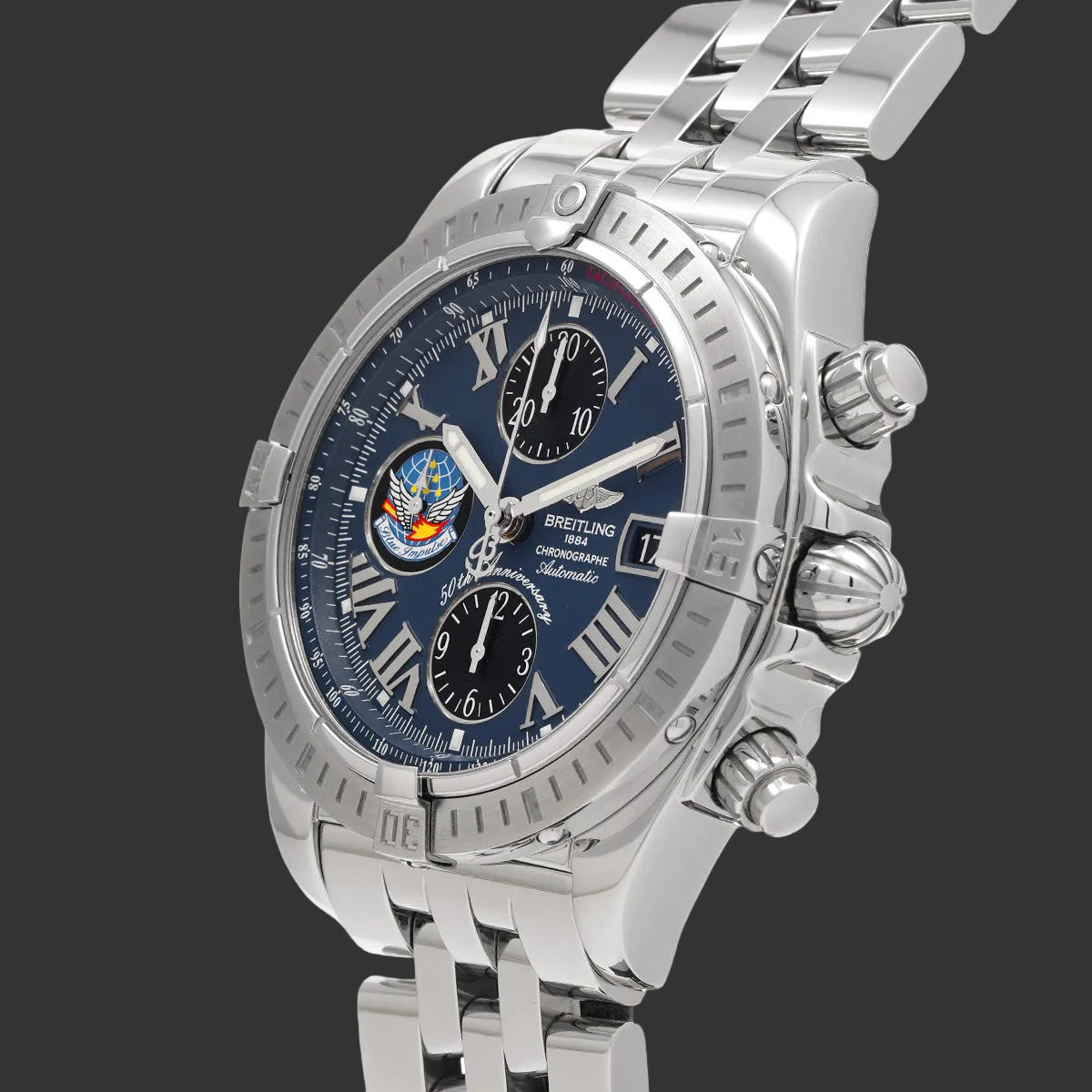 A vibrant tribute to the legendary Japanese aerobatic team, this Chronomat Evolution Blue Impulse embodies the perfect alliance between aeronautical heritage and precision watchmaking. Its deep blue dial, enhanced with Roman numerals and an exclusive winged emblem, gives this limited edition a distinctive personality that aviation enthusiasts will recognize at first glance.