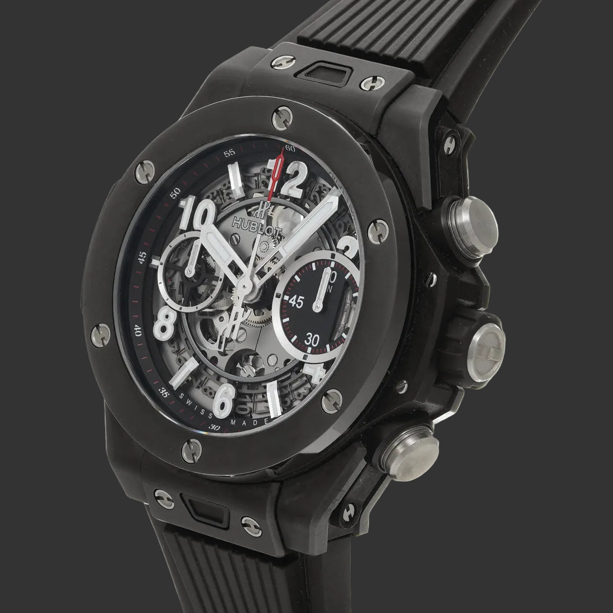 The 42 mm barrel-shaped case in matte black ceramic imposes a strong character without excess. The six H screws on the bezel immediately sign the Hublot identity. The openworked dial reveals the movement's gears, offering a fascinating reading of time passing.