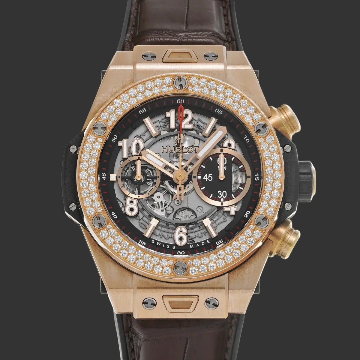 The Big Bang Unico embodies Hublot's avant-garde spirit: fusion of noble materials, contemporary architecture and exceptional watchmaking expertise. This reference 411.OX.1180.RX.1104 in King Gold set with diamonds asserts a resolutely bold personality.