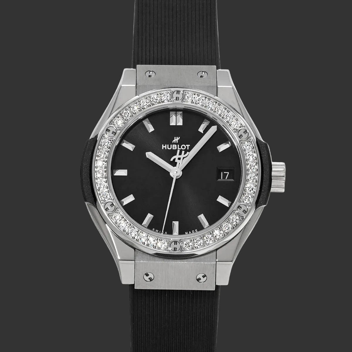 With its 29mm titanium case, this Classic Fusion offers a delicate yet distinctive presence. The deep black dial enhances the baton indices and creates a striking contrast with the sparkling diamonds of the bezel. The black rubber bracelet, a Hublot signature, adds a sporty touch and remarkable comfort.