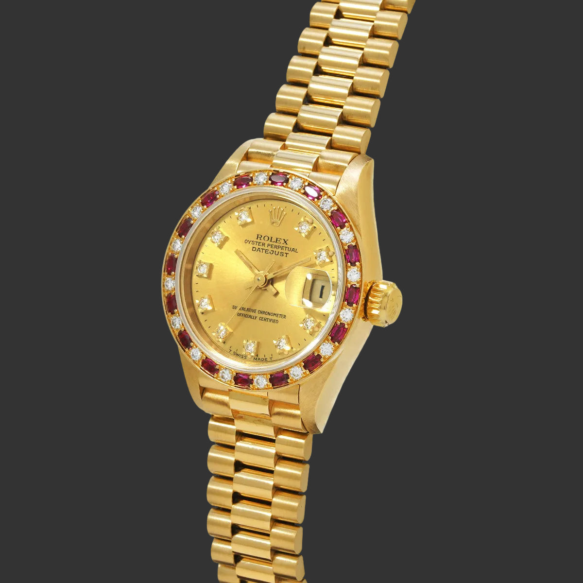 This Rolex Lady-Datejust embodies the feminine excellence of the Geneva manufacture. Crafted in 18-carat yellow gold, it features a bezel sumptuously set with alternating diamonds and rubies, creating a captivating play of light between the white brilliance and the purple reflections.