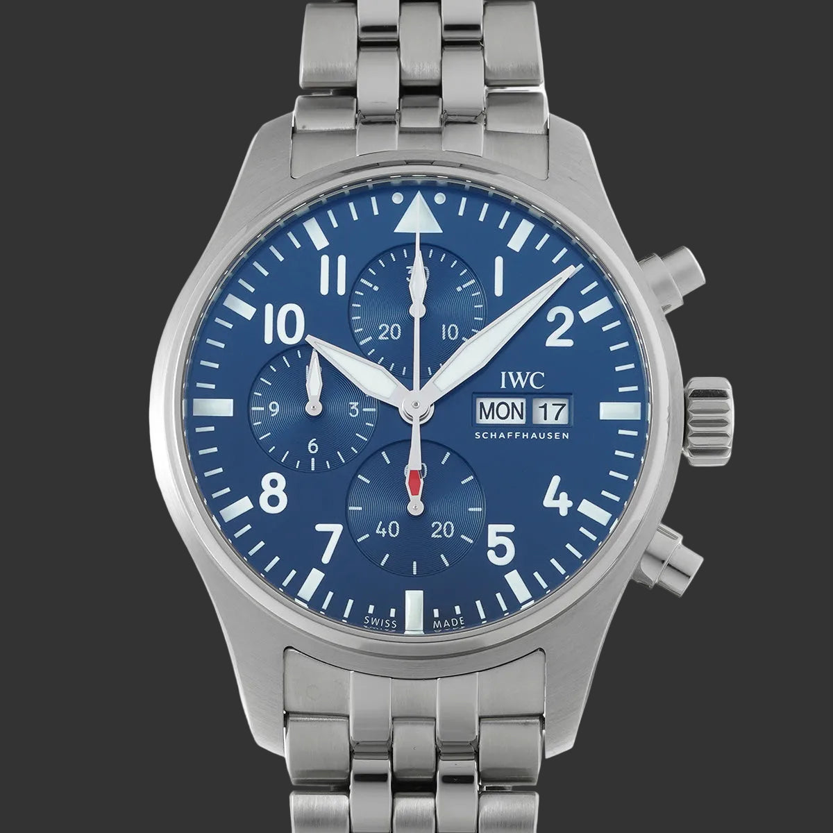 With its 43 mm diameter and characteristic lateral lugs, this Pilot Chronograph imposes a resolutely masculine style. The brushed-polished finish on the steel reveals remarkable attention to detail, while the three-link trapezoidal bracelet ensures optimal comfort.