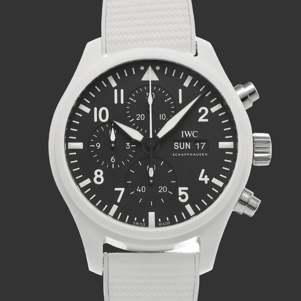 The white ceramic gives this pilot's chronograph a singular presence. The black dial with typical Arabic numerals of aviator watches offers instant reading, while the red chronograph hand adds a touch of dynamism. The textured rubber strap completes this resolutely sporty and modern aesthetic.