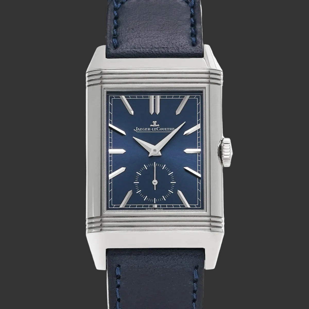 A timeless icon born in 1931, the Reverso embodies the perfect alliance between watchmaking heritage and ingenious functionality. This Reverso Tribute Duo Petite Seconde in steel features a sumptuous deep blue dial enhanced with applied baton indexes and polished Dauphine hands. A model that combines refinement with strong character.