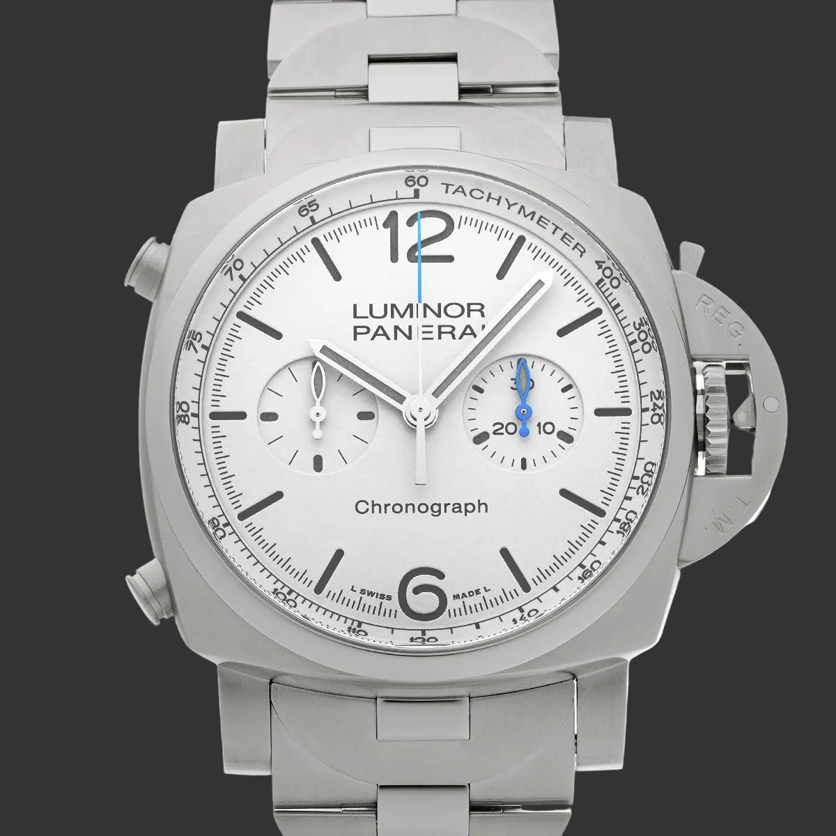 The 44mm stainless steel case imposes its style without compromise. The white dial, enhanced with Arabic indices and chronograph subdials, offers exemplary readability. The blue luminescent hands add a touch of refinement to the whole.