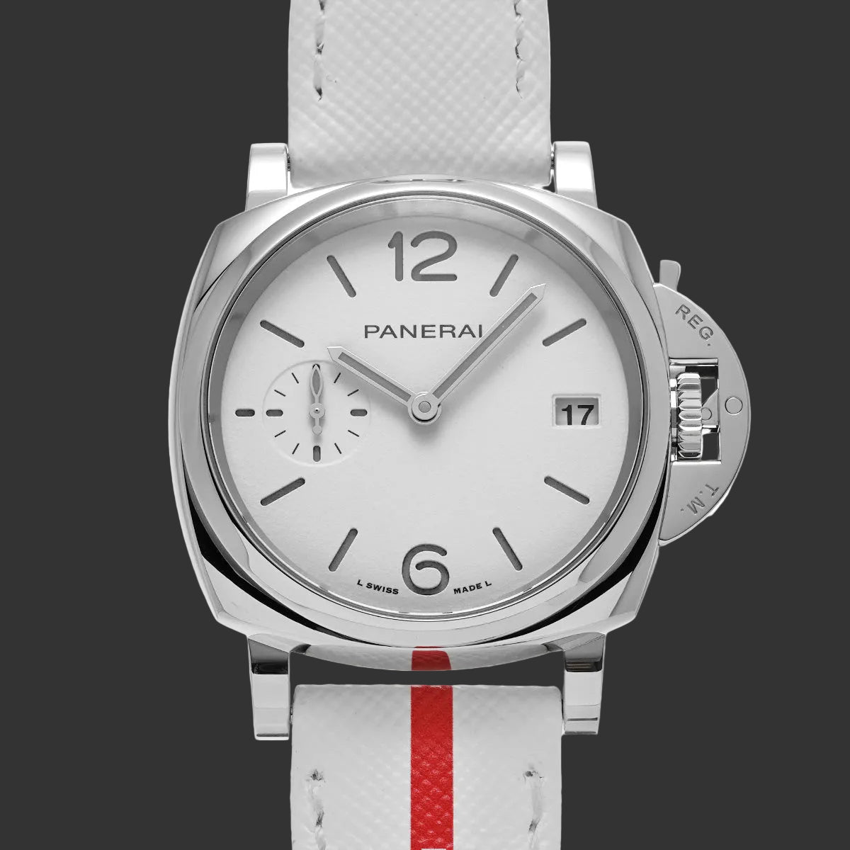 The immaculate white dial, punctuated by applied Arabic numerals and a small seconds at 9 o'clock, exudes clarity and readability. The white leather strap crossed with the signature Luna Rossa red stripe adds a unique touch of character, evoking the world of competitive sailing.