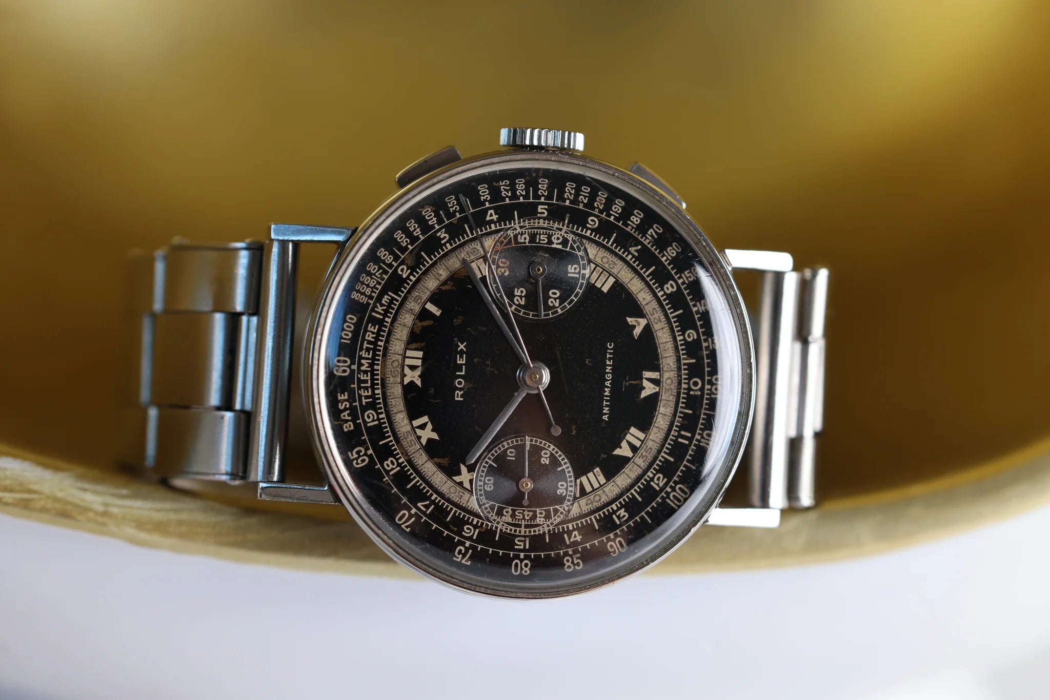 Ce chronographe s'adresse à l'amateur d'horlogerie historique, celui qui comprend la valeur d'une pièce témoin des premières heures de Rolex. Son boîtier 33 mm aux cornes courtes intégrées et son fond gravé du logo Rolex "Bart Simpson" racontent près d'un siècle d'histoire horlogère.
