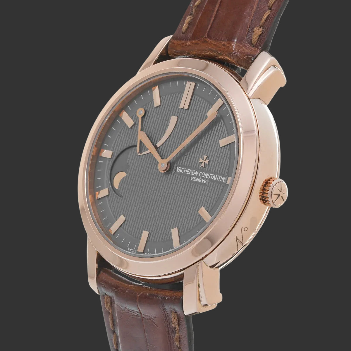 The 38mm 18-karat rose gold case houses a beautifully guilloché anthracite grey dial. The moon phase and power reserve indicator lend a contemplative dimension to this exceptional dress watch. Rose gold hands and baton hour markers complete this visual harmony.