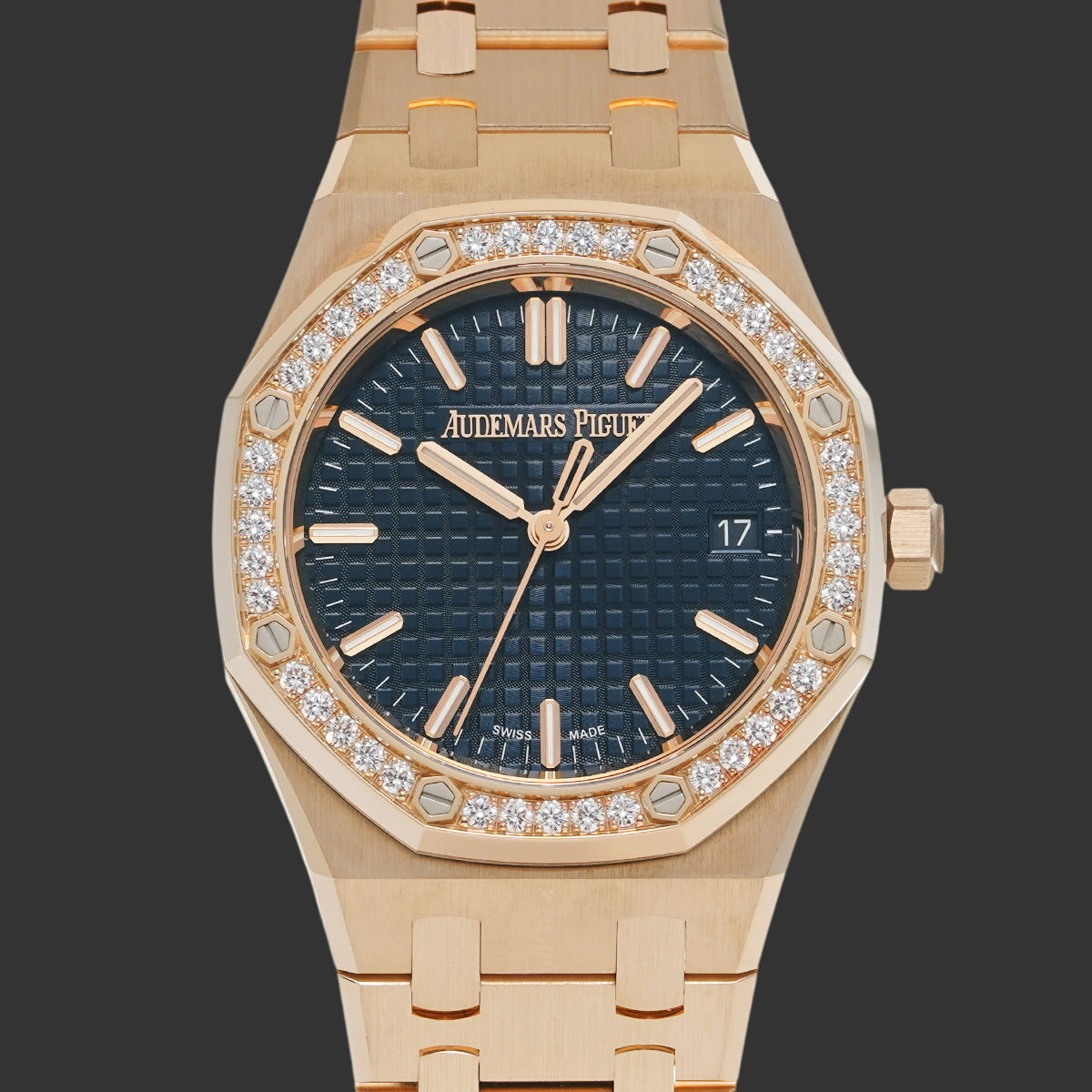 Avec ses 34 mm de diamètre, cette Royal Oak offre une élégance affirmée sans ostentation. Le contraste entre l'éclat chaleureux de l'or rose, le scintillement des diamants et la profondeur du cadran bleu crée une harmonie visuelle saisissante. Le bracelet intégré trois mailles épouse parfaitement le poignet pour un confort remarquable.