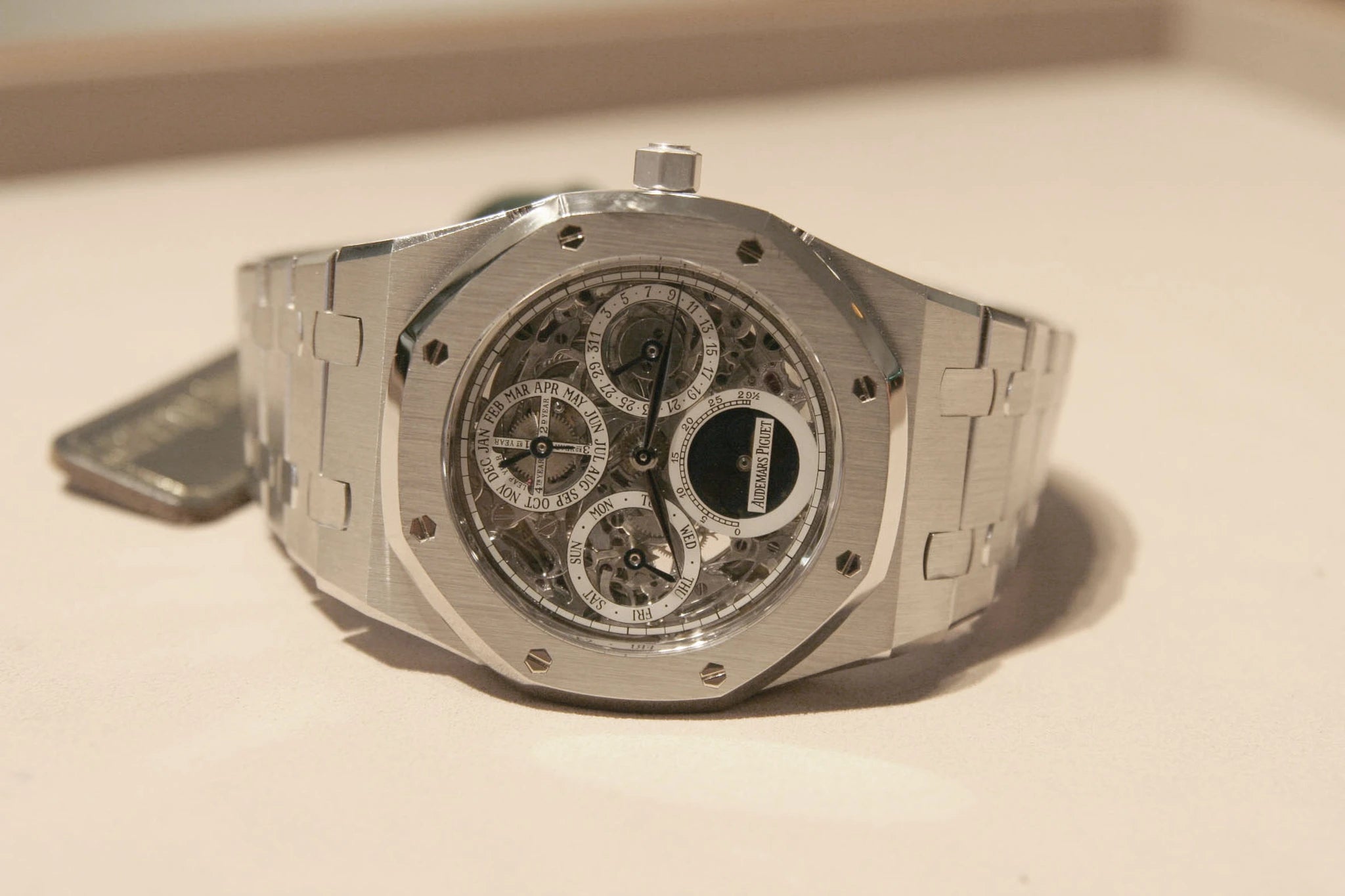 Parmi les références les plus convoitées de la maison Audemars Piguet, la Royal Oak Perpetual Calendar 25829ST occupe une place à part. Cette pièce de collection rare dévoile l'intégralité de son calibre manufacture AP 2120/2802 à travers un squelettage réalisé entièrement à la main. Le boîtier octogonal en acier de 39 mm abrite un calendrier perpétuel complet (date, jour, mois, année bissextile et phase de lune), tandis que le fond saphir prolonge le spectacle mécanique. Proposée en excellent état avec son ensemble complet incluant boîte, papiers et extrait d'archives, cette pièce a bénéficié d'une révision complète en 2025.