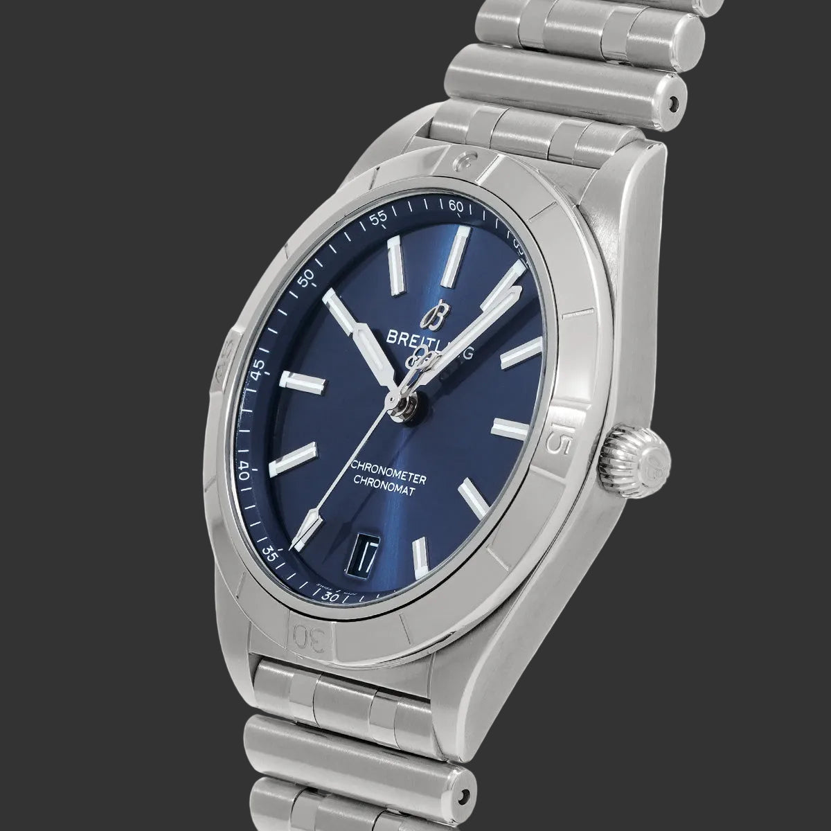 La Breitling Chronomat Automatique 36 incarne l'alliance parfaite entre caractère sportif et raffinement féminin. Son cadran bleu sunburst capte la lumière avec une profondeur saisissante, sublimé par des index bâtons appliqués qui lui confèrent une lisibilité remarquable.