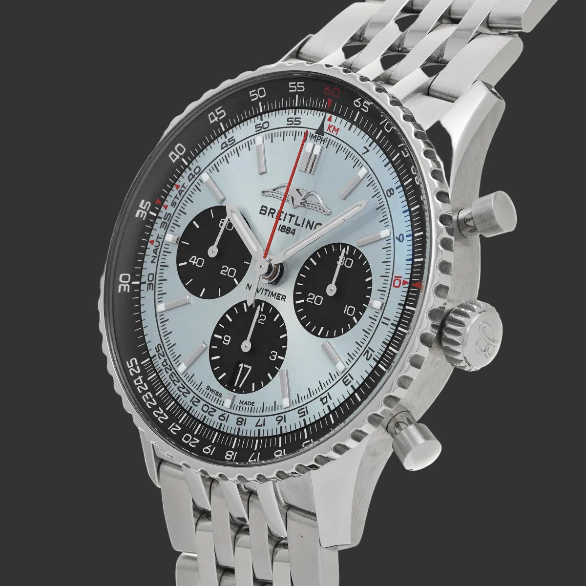 Symbole incontesté de l'aviation depuis 1952, la Navitimer incarne l'excellence horlogère Breitling. Cette référence AB0138241C1A1 sublime l'héritage avec un cadran bleu glacier soleillé d'une élégance saisissante, rehaussé de trois compteurs noirs et d'une aiguille chronographe rouge vif.
