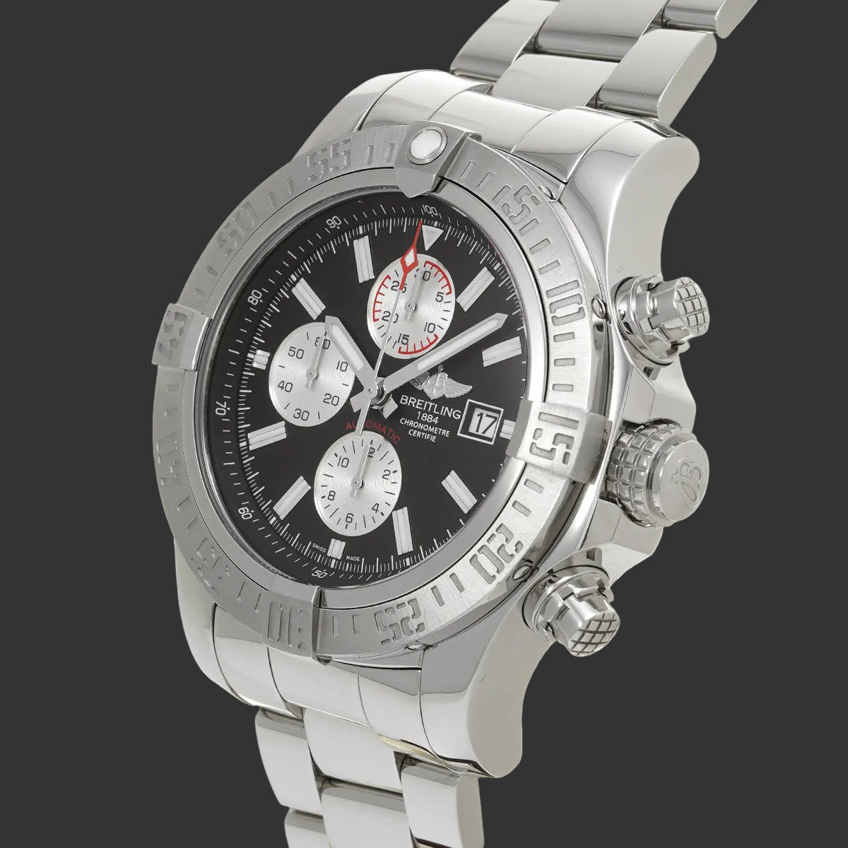 La Breitling Super Avenger II incarne l'esprit des instruments de mesure professionnels. Ce chronographe certifié COSC conjugue robustesse assumée et finition soignée, avec son boîtier imposant en acier et son cadran noir rehaussé de compteurs contrastés.
