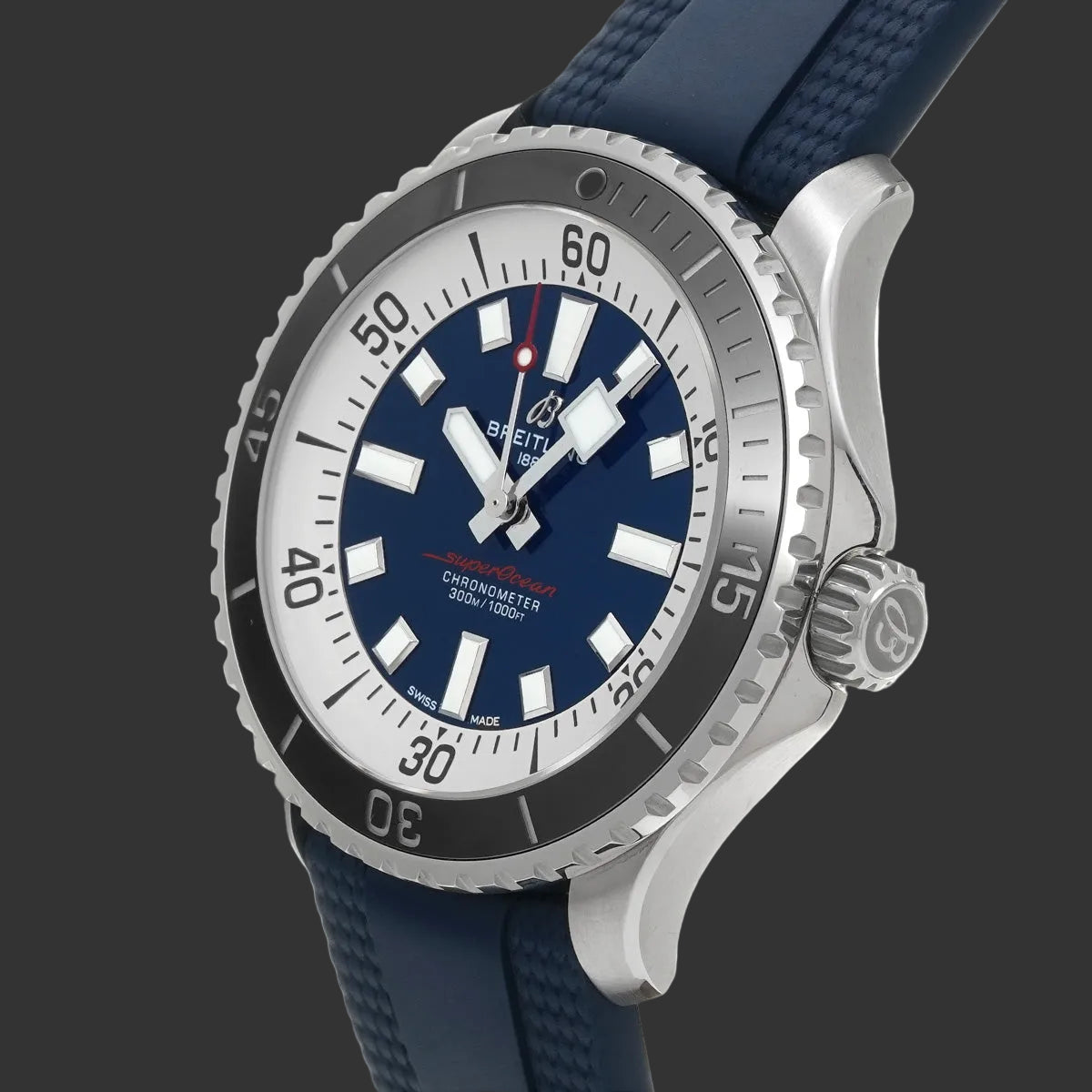 La Breitling Superocean Automatique 44 incarne l'esprit d'aventure marine de la manufacture suisse. Avec son cadran bleu profond et sa présence imposante, cette référence A17376211C1S1 s'adresse aux amateurs de montres de plongée qui refusent les compromis entre performance et élégance.