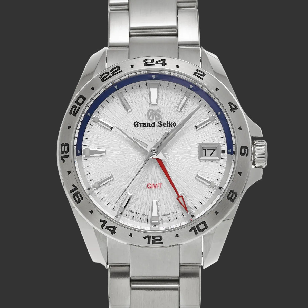 Le cadran blanc argenté révèle la célèbre finition Zaratsu, technique de polissage miroir héritée des sabres japonais. L'aiguille GMT rouge contraste avec élégance, offrant une lecture instantanée du second fuseau horaire grâce à la lunette bidirectionnelle 24h.