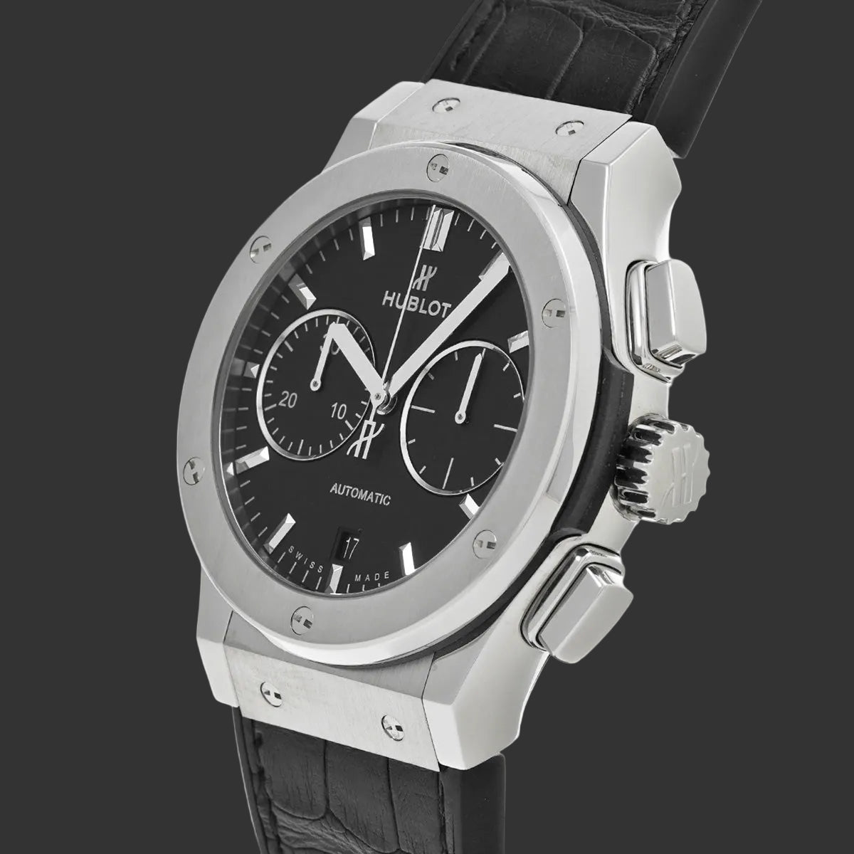 La Hublot Classic Fusion Chronograph incarne parfaitement la philosophie de fusion chère à la manufacture. Cette référence 521.NX.1171.LR associe un boîtier en titane à un cadran noir mat d'une sobriété remarquable, créant une pièce résolument contemporaine qui sait se faire discrète tout en affirmant son caractère.