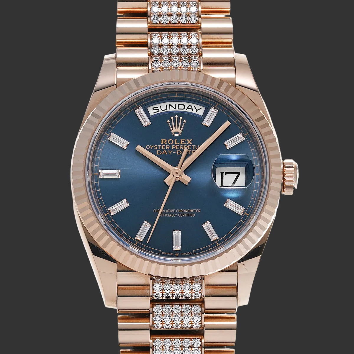 La Day-Date incarne depuis toujours le sommet de la sophistication horlogère. Cette référence 128235 en or Everose 18 carats révèle un cadran bleu sunburst captivant, rehaussé d'index en pierres précieuses qui captent la lumière avec raffinement.