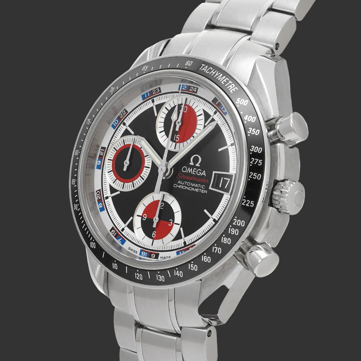 Avec son boîtier acier de 40 mm et sa lunette tachymétrique rotative, cette Speedmaster affirme sa vocation de chrono sport. Le contraste saisissant entre le cadran noir mat et les touches de rouge apporte une touche de dynamisme rare dans la collection.