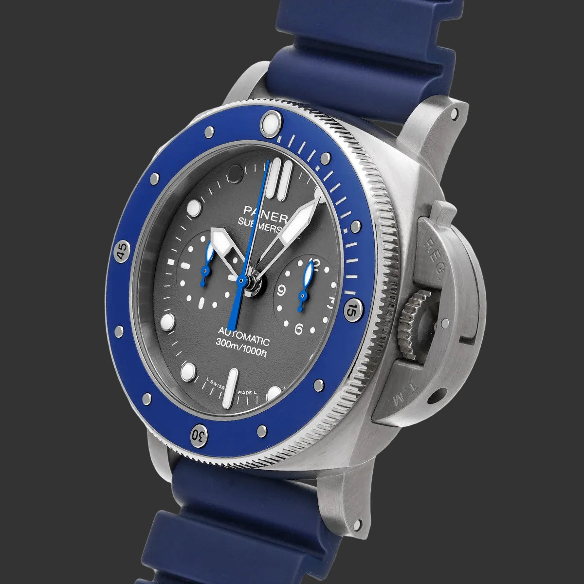 Le boîtier coussin de 47 mm en titane impose sa présence avec assurance tout en restant léger au poignet. La lunette céramique bleu profond évoque instantanément les fonds marins, tandis que le cadran gris anthracite offre une lisibilité exemplaire grâce à ses index luminescents.