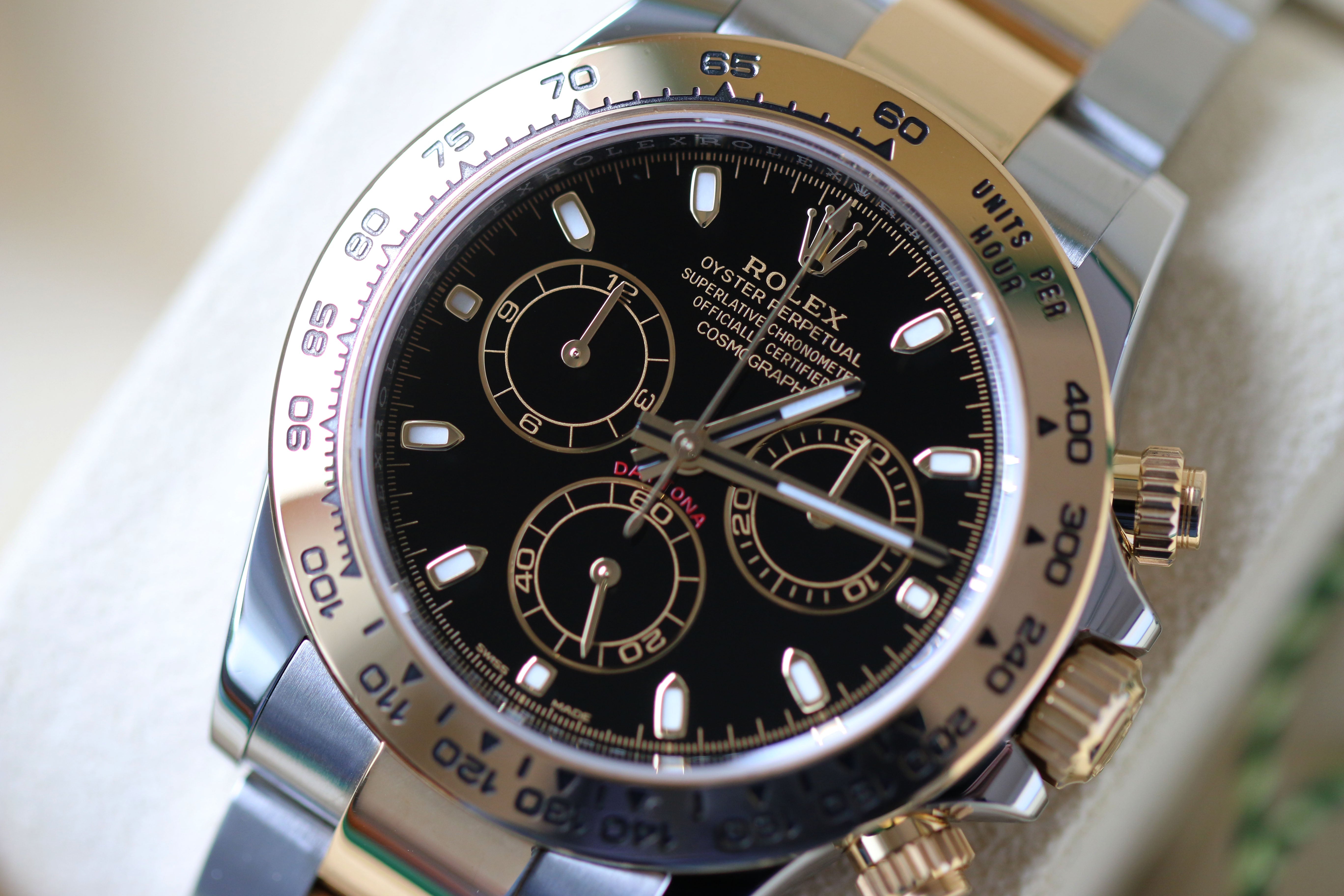 La Rolex Cosmograph Daytona 116503 incarne l'essence du chronographe sportif de prestige. Cette version two-tone marie avec élégance l'acier Oystersteel à l'or jaune 18 carats, créant une présence au poignet à la fois affirmée et raffinée. Son cadran noir profond rehaussé d'index dorés offre une lisibilité irréprochable et un contraste saisissant.