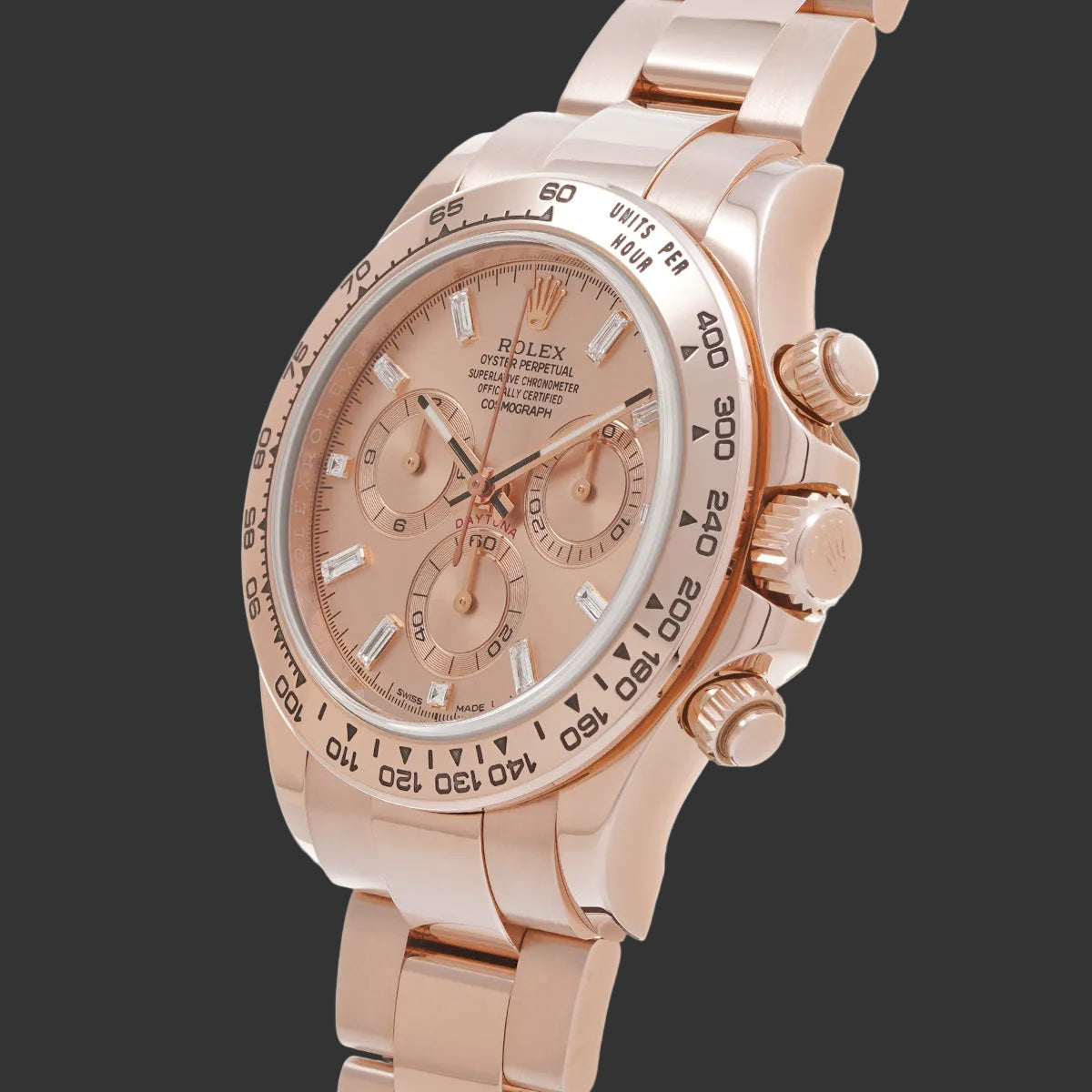 Avec son boîtier de 40 mm et son bracelet Oyster trois mailles entièrement en or Everose, cette Daytona impose une élégance discrète mais affirmée. La lunette tachymétrique gravée rappelle son héritage racing, tandis que les compteurs du chronographe offrent une lisibilité exemplaire.