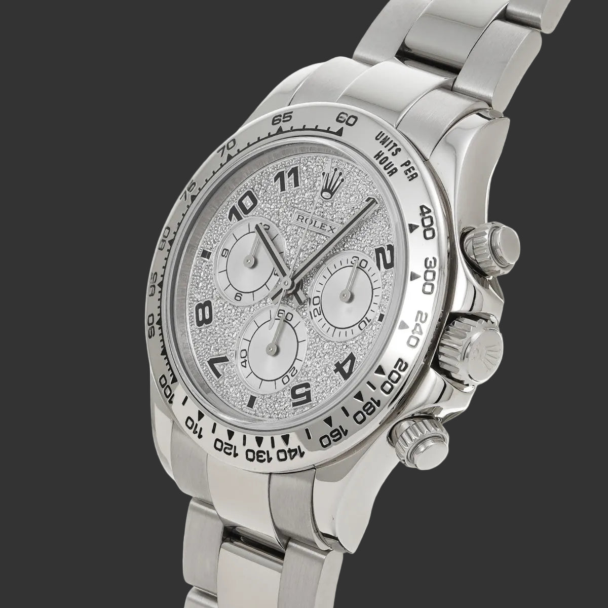 Le contraste saisissant entre l'éclat des diamants et les trois compteurs argent confère à cette Daytona une présence singulière. Les index arabes noir ajoutent une touche de lisibilité sportive à cet ensemble précieux. Au poignet, elle impose un style affirmé sans jamais tomber dans l'ostentation.