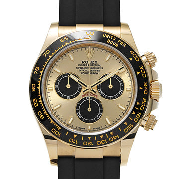 725184 ROLEX 126518LN Cosmograph Daytona Champagne Noir brillant Caoutchouc Montre Homme. Une variation sportive de la Cosmograph Daytona avec boîtier en or jaune, bracelet Oysterflex et lunette Cerachrom. Ceci est la Ref.126518LN, apparue en 2023 en tant que nouveau modèle remplaçant le Ref.116518LN précédent. Elle est équipée du mouvement interne de dernière génération Cal.4131, intégrant l'échappement Chronergy et les dernières technologies Rolex, avec d'autres améliorations internes et externes. Réserve de marche d'environ 72 heures. État : Neuf. Condition : N. Lunette : . Bracelet : . Boucle : . Liste des accessoires : Boîte d'origine, Livret. Certificat : Acheté en janvier 2026. Garantie : . Dégâts. Verre : . Boîtier : . Bracelet : . Lunette : . Fermoir : . Commentaires de condition. Condition générale : . L'intérieur : . L'extérieur : . Commentaires par partie. Boîtier : . Lunette : . Bracelet : . Fermoir : . Cadran : . Verre : . Luminescence : . Aiguilles :