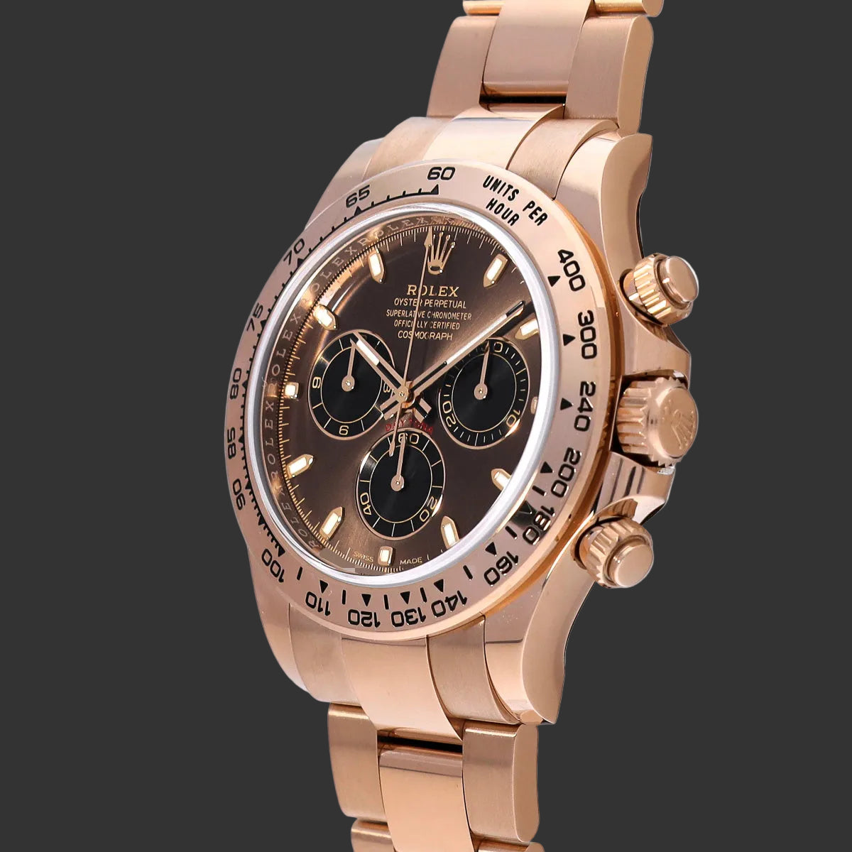 Le cadran marron chocolat à finition sunburst capte la lumière avec subtilité. Ses compteurs circulaires et index bâton en or rose créent un contraste raffiné, signature des Daytona les plus recherchées par les collectionneurs avertis.