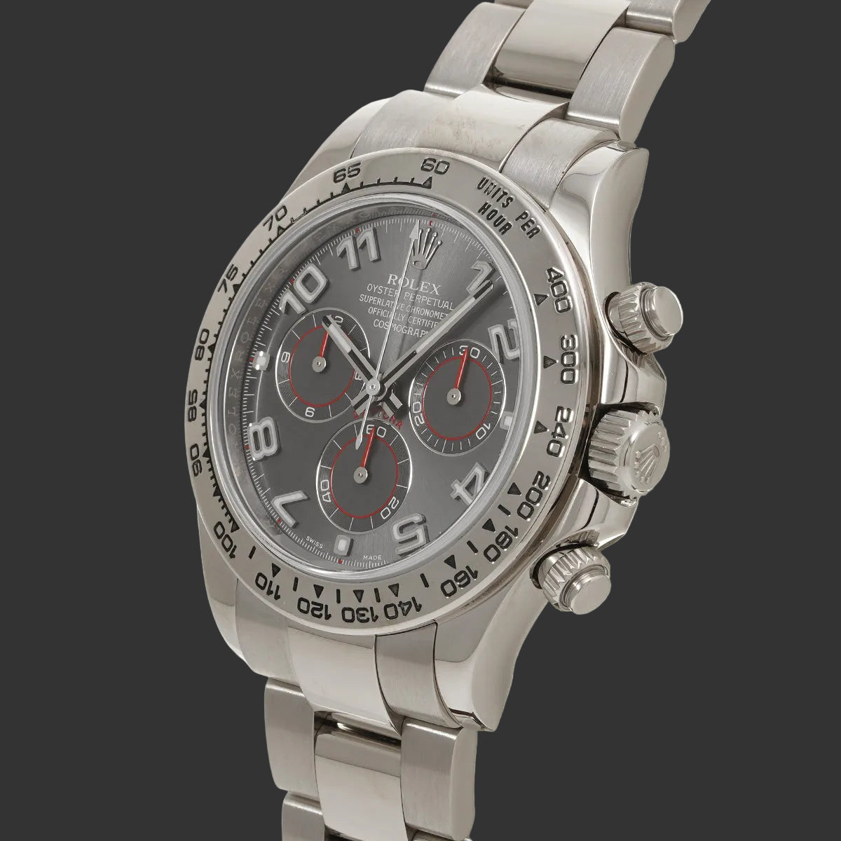 Avec ses 40 mm taillés dans l'or blanc massif, cette Daytona dégage une élégance discrète mais indéniable. La lunette tachymétrique laquée et le bracelet Oyster affirment son caractère sportif tout en conservant un raffinement absolu. Le contraste entre le gris profond du cadran et les touches de rouge des compteurs crée un équilibre visuel captivant.