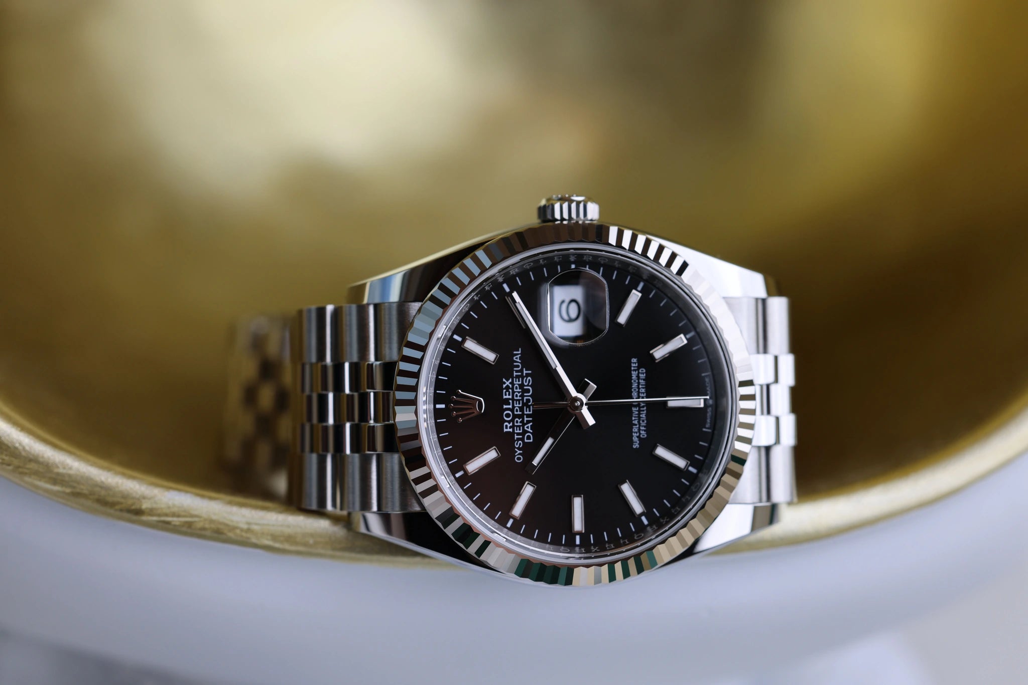 Le boîtier acier 36 mm arbore une lunette cannelée en or blanc qui signe immédiatement l'appartenance à l'univers Rolex. Ce contraste subtil entre l'éclat froid de l'or blanc et la robustesse de l'acier 904L crée une présence au poignet à la fois discrète et sophistiquée.