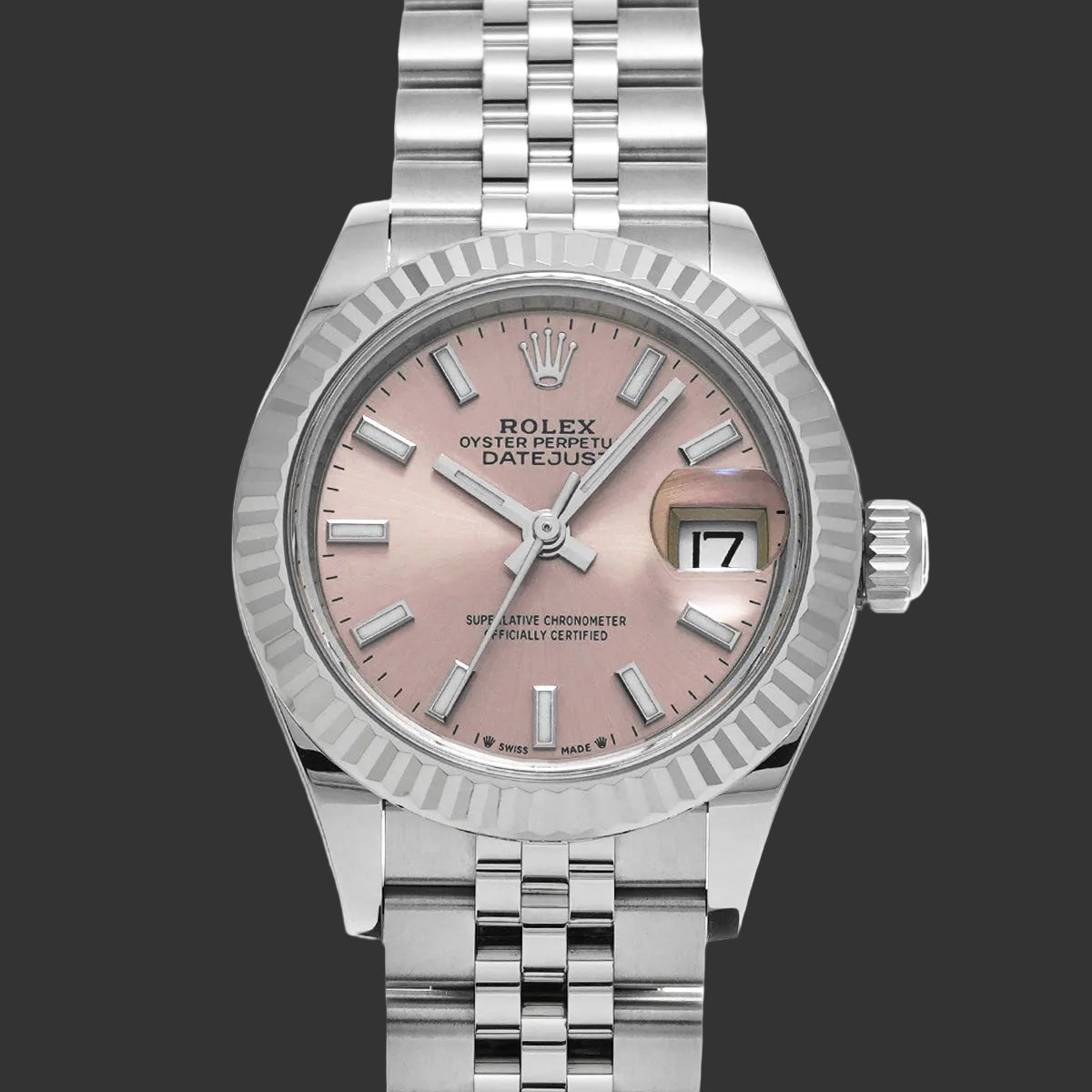 Cette Rolex Lady Datejust incarne la quintessence de la montre de luxe pour femme. Son cadran rose délicat, rehaussé d'index bâtons, dialogue harmonieusement avec la lunette cannelée en or blanc.