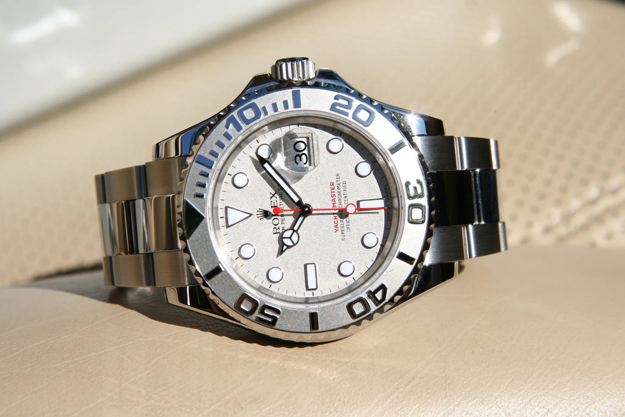 La Yacht-Master 40 réf. 16622 incarne l'esprit de la navigation de plaisance avec une sophistication rare. Son cadran gris platine aux reflets satinés, ponctué par la trotteuse rouge signature, crée un équilibre visuel saisissant entre sportivité et raffinement.