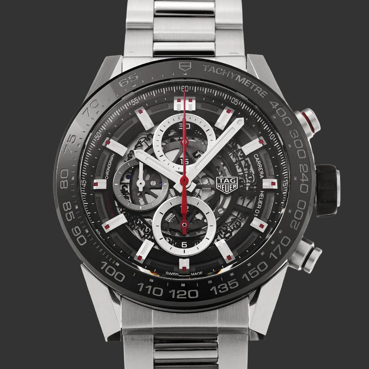 Avec son boîtier acier de 43 mm et sa lunette tachymétrique noire, cette Carrera affirme un caractère résolument sportif. Le contraste saisissant entre les compteurs blancs, les aiguilles rouges du chronographe et le noir profond du cadran squelette crée une lisibilité exemplaire et une esthétique racée.