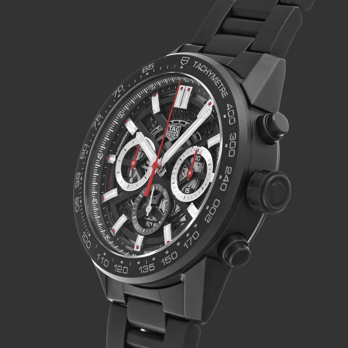 Le boîtier céramique de 45 mm impose une présence assumée au poignet. La lunette tachymétrique graduée jusqu'à 400 km/h rappelle l'ADN compétition de la collection Carrera, tandis que les touches de rouge vif sur les aiguilles du chronographe apportent un dynamisme saisissant sur fond noir.